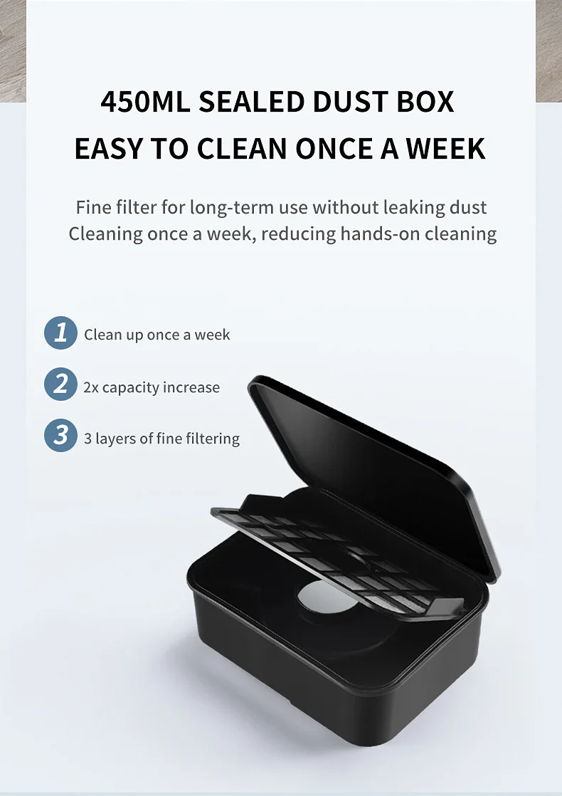 Функция продукта: запуск одним нажатием кнопки, поглощение пыли и волос, окурки для сигарет, скорлупы семян подсолнечника, автоматическое изменение направления и т. д., Встроенная литиевая батарея 3000 мА.