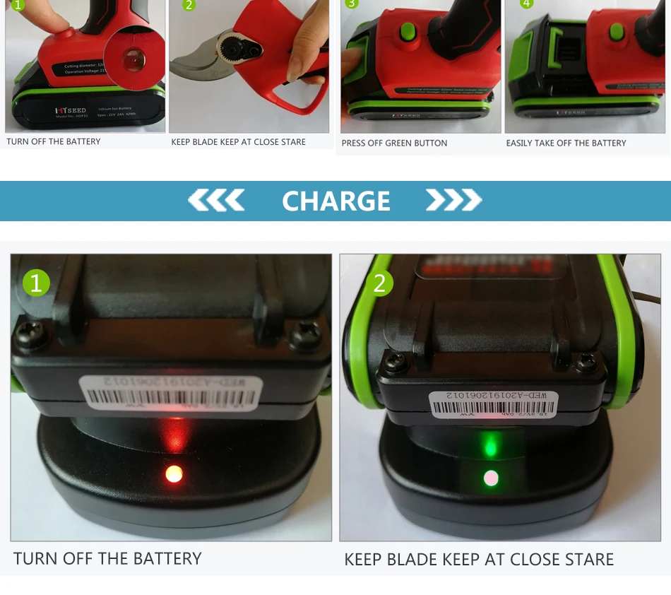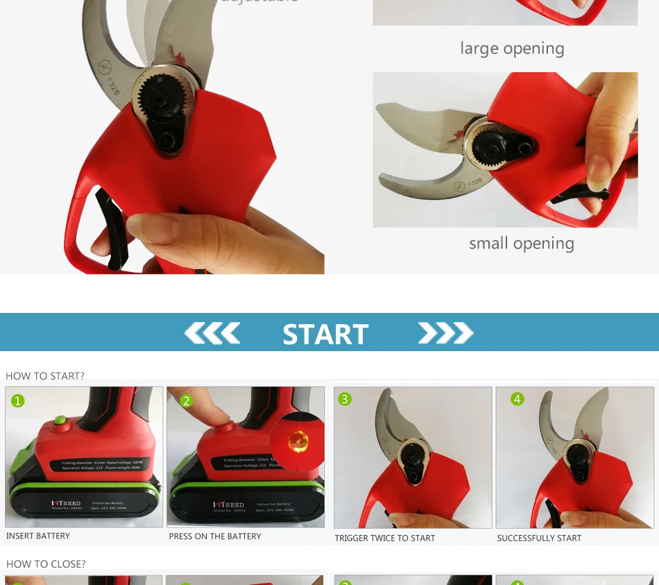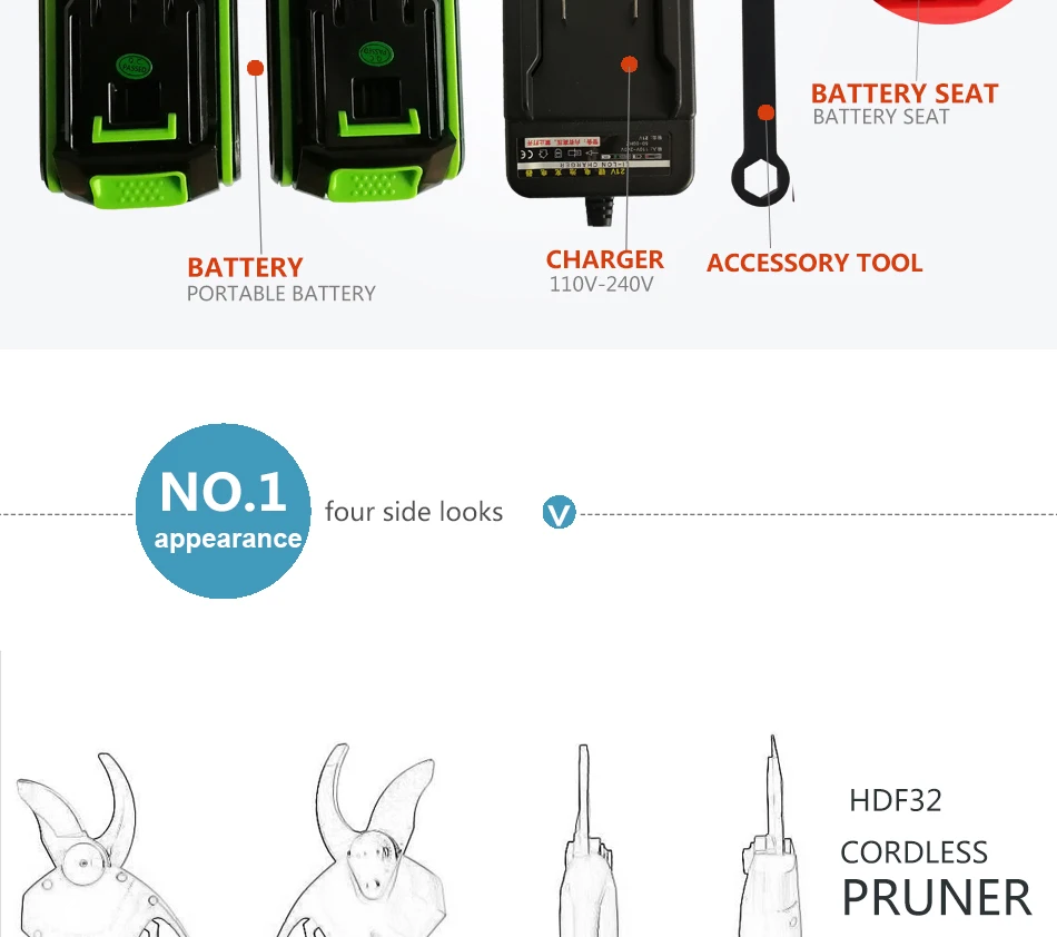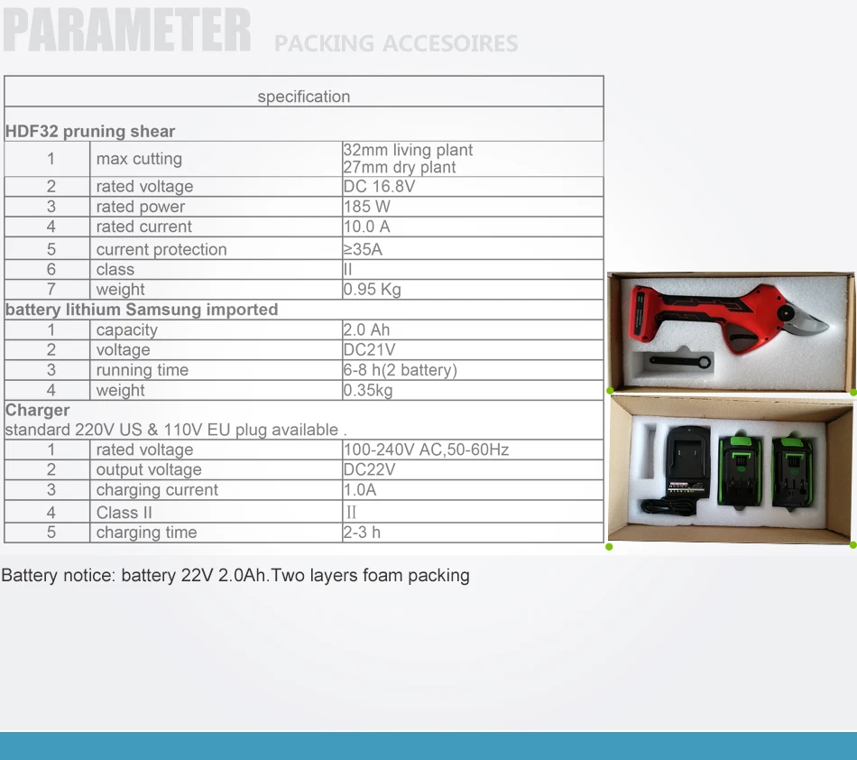 Самый большой беспроводной Электрический секатор Спецификация HDPF32 обрезные ножницы 1 Максимальная резка живого растения 32 мм Сухое растение 28 мм 2 номинального напряжения 22 В постоянного тока 3 Номинальная Мощность 185 Вт 4 номинального тока 10,0 А 5. Защита от тока ≥ 35 А 6 класс II 7 вес 0,95 кг Литиевая батарея Samsung импортная 1 Емкость 2 Ач 2 напряжения DC21V 3 Время работы 6-8 ч (2 батареи) 4 Вес 0,35 кг Зарядное устройство Доступны стандартные вилки 220 В для США и 110 В для ЕС. 1 Номинальное напряжение 100-240 В переменного тока, 50-60 Гц 2 выходного напряжения 22 В постоянного тока 3 зарядный ток 1.0A 4 класс II 5 время зарядки 2-3 часа