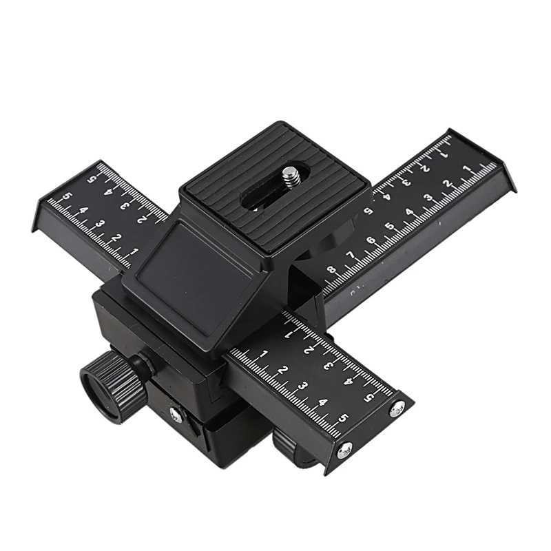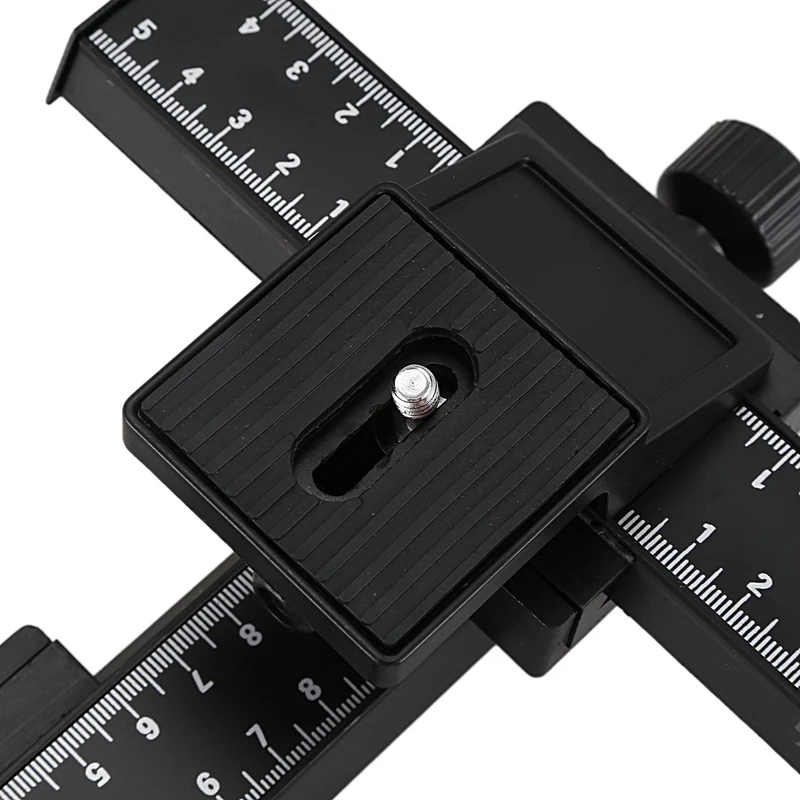 Две 6-дюймовые направляющие позволяют перемещаться в четырех направлениях: вправо, влево, вперед и назад. Крепление и использование винтов с резьбой 1/4 "x 20 для большинства штативов.