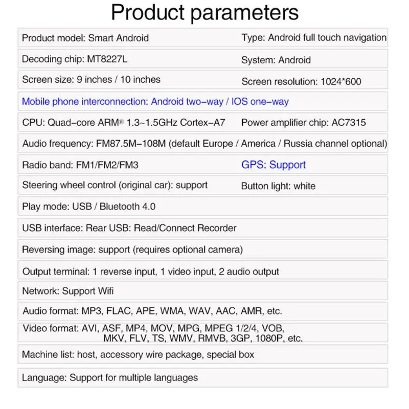 100% новый и высокое качество Особенности: Автомобильная Мультимедийная система для получения удовольствия от вождения, поддержка USB/Поддержка sd-карты, поддержка видео высокой четкости 1080P, воспроизведение музыки без потерь, придаст больше удовольствия от вождения и опыта владельцу автомобиля. Замените старую стереосистему на новую умную автомобильную радиосистему и наслаждайтесь интернет-развлеканием в дороге. С 4-ядерным процессором CPU устройство имеет больше возможностей, может обеспечить вам лучшую производительность многозадачности и быстро ответить. Мобильный телефон может управляться устройством через USB телефон, и все видео может быть зеркальным на радио. С помощью онлайн-навигационной системы водитель может избежать пробок заранее. Поддержка нескольких языков, до 70 национальных языков. Поддерживает соединение с оригинальным рулевым колесом cal. Характеристики: Материалы: АБС-пластик Тип: GPS сенсорный навигатор Чип декодирования: MT8227L Размер экрана: 9 дюймов Разрешение экрана: 1024x600 Мобильный телефон: двусторонний/односторонний ЦП: четырехъядерный процессор ARMB 1,3 ~ 1 .5 ГГц Cortex-A7 Чип усилителя мощности: AC7315 Частота: FM87.5M-108M (по умолчанию канал Европа/Америка/Россия опционально) Радиосвязь: FM1/FM2/FM3 GPS: поддержка Управление рулем (оригинальный автомобиль): Поддержка Кнопочный светильник: белый Режим воспроизведения: USB / Bluetooth 4,0 Интерфейс USB: задний USB: Чтение/подключение рекордера Изображение заднего хода: поддержка (требуется дополнительная камера) Выходной терминал: 1 обратный вход, 1 видеовход, 2 линейный выход Веб: Поддержка Wifi Формат: MP3, FLAC, APE, WMA, WAV, AAC, AMR и т. Д. Формат видео: AVI, ASF, MP4, MOV, MPG, MPEG 1/2/4, VOB, MKV, FLV, TS, WMV, RMVB, 3GP, 1080P и т. Д. Язык: Поддержка нескольких языков Размер: app.41x14x32,3cm/16.14x5.51x12.72in Цвет: черный Количество: 1 комплект Примечание: Возможны отклонения в 0-1 см вследствие измерений вручную. Пожалуйста, убедитесь, что вы не возражаете, прежде чем сделать ставку. Из-за разницы между различными мониторами изображение может не отражать фактический цвет изделия. Спасибо! Посылка включает в себя: 1 х сенсорный навигатор 1 x аксессуары проволочная посылка 1 x Руководство пользователя 1 x упаковочная коробка (другие демонстрационные аксессуары на картинке не включены.)