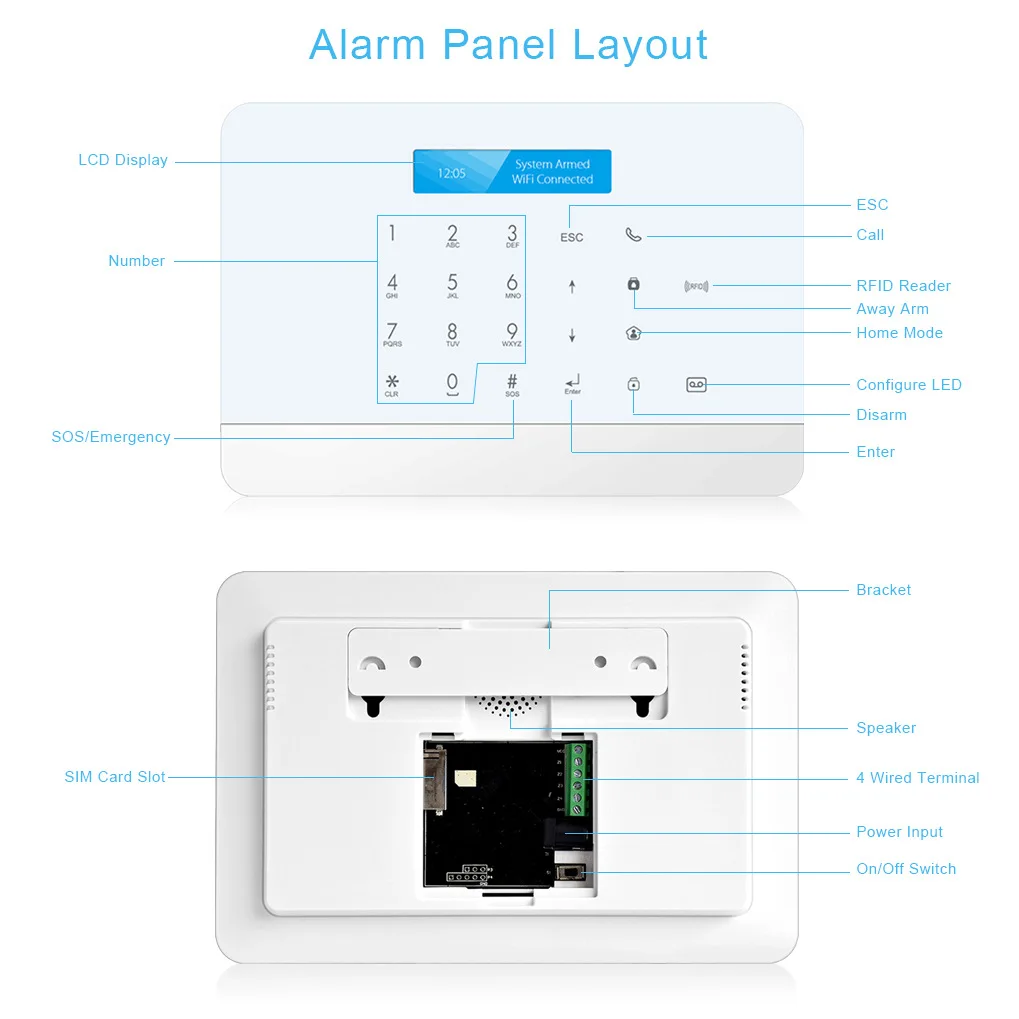 GSM умная WIFI сигнализация Беспроводная gsm домашняя Противоугонная сигнализация Размер изделия: 190*30*110 мм Размер цветной коробки: 210*125*140 мм Количество упаковки: 20 шт. в коробке Размер коробки: 460*270*210 мм Вес нетто продукта: 800 г Вес брутто продукта: 820 г Вес брутто внешней коробки: 17 кг