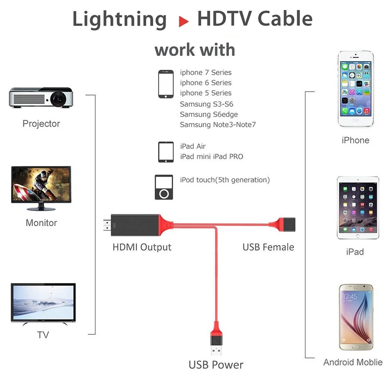 The iPhone HDMI cable supports mirroring of what is displayed on your device sn-including movies,TV show,music,video,o,photo and more-to your HDMI-equipped TV or projector in up to 1080p HD.