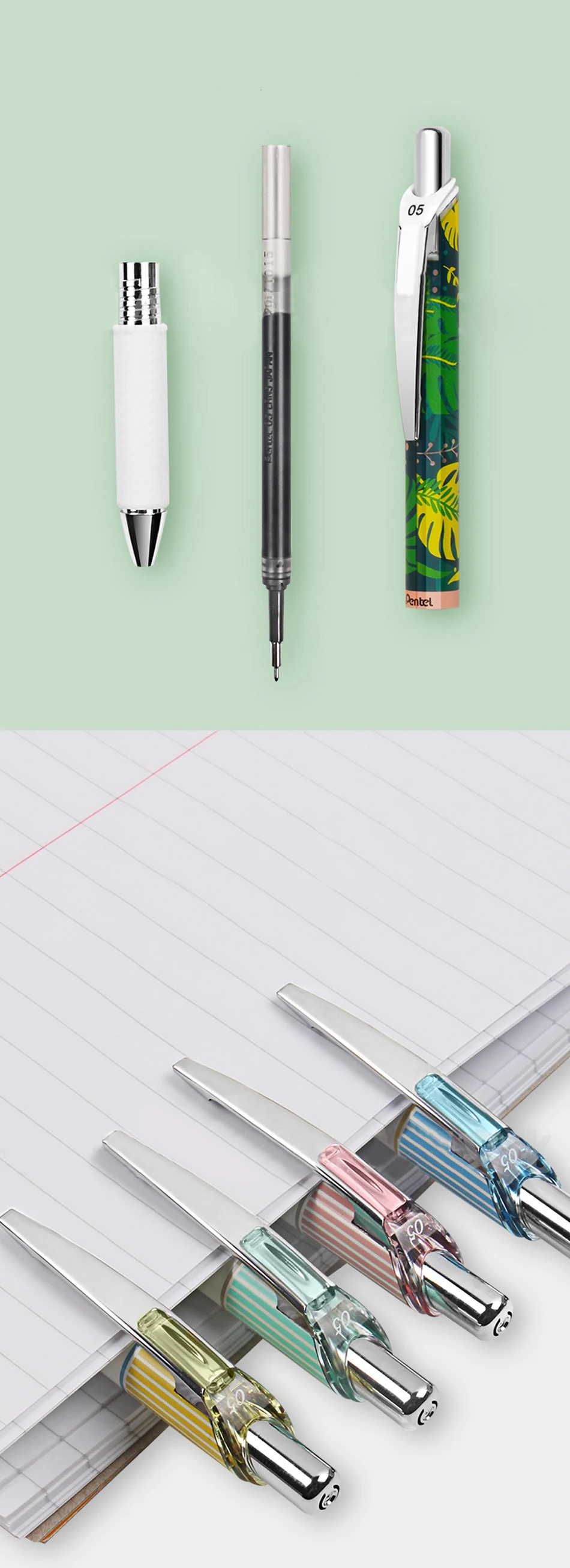 Rubber pen grip and needle tip Non-slip texture soft grip/writing grip feel comfortable Quick-drying ink does not spill ink / metal needle pen / writing smoothly Replaceable core · writing battery life Refill can be replaced/selected in the middle of the barrel You can replace the refill / increase the writing endurance Metal pen holder·Portable Comes with a metal pen holder / you can clip the pen to the book