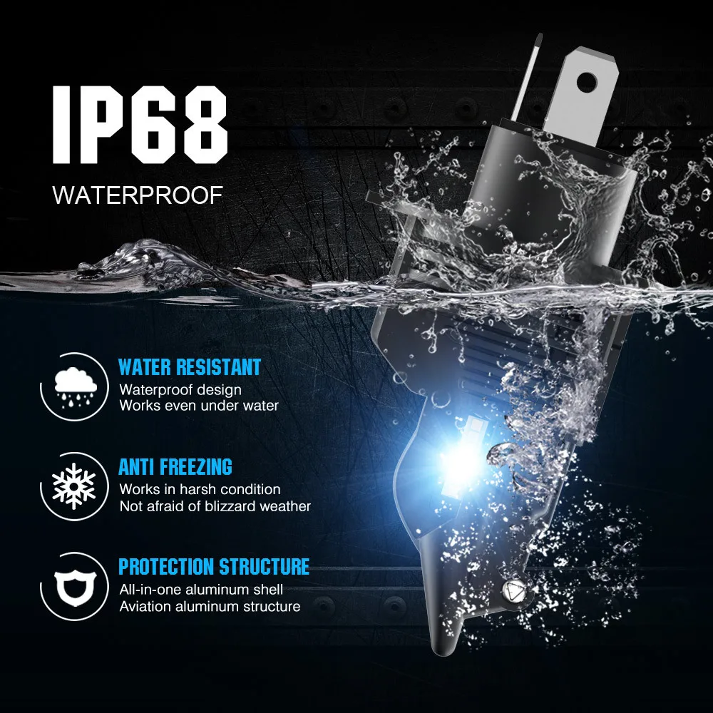 【 1:1 DESIGN】Модернизированный1:1 самый маленький дизайн, такой же, как ваши галогенные лампы, Подходит для 100% транспортных средств, PLUG & PLAY, очень легко установить, и он не будет сбивать колпачок отражателя в сборе, IP68 водонепроницаемый, пыленепроницаемый.
