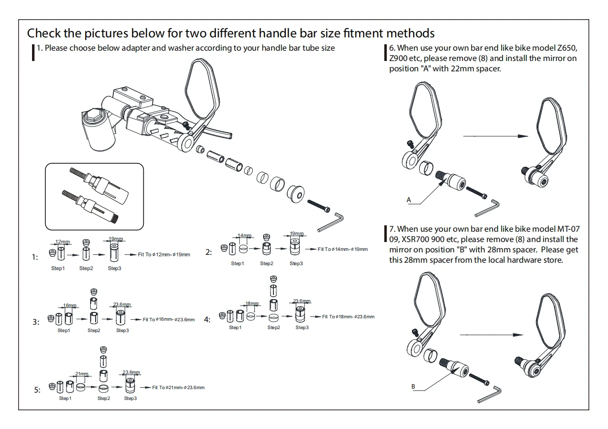 Это зеркала руля для руля диаметром 22 мм с трубкой внутреннего диаметра от 12 до 23 мм. (в комплект входят несколько прокладочных колец разных диаметров.)