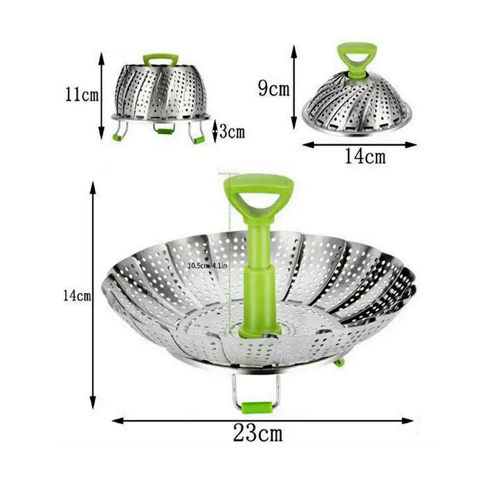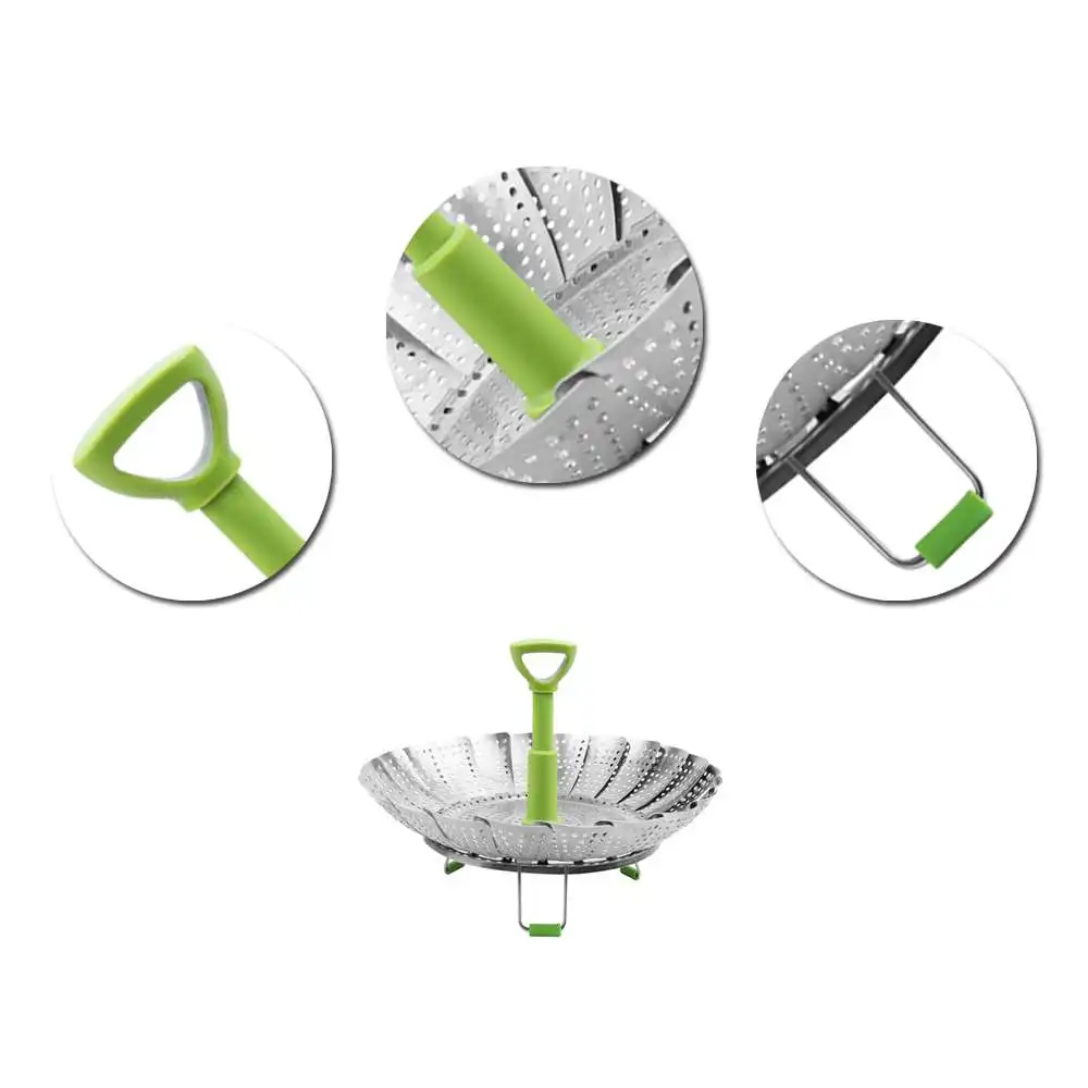 6. The steamer can be folded for storage, and can be expanded to fit various sizes of pots/pans and pressure cookers, thus turning your favorite pot into a safe steamer. It opens like a water lily and folds compactly to save storage space.